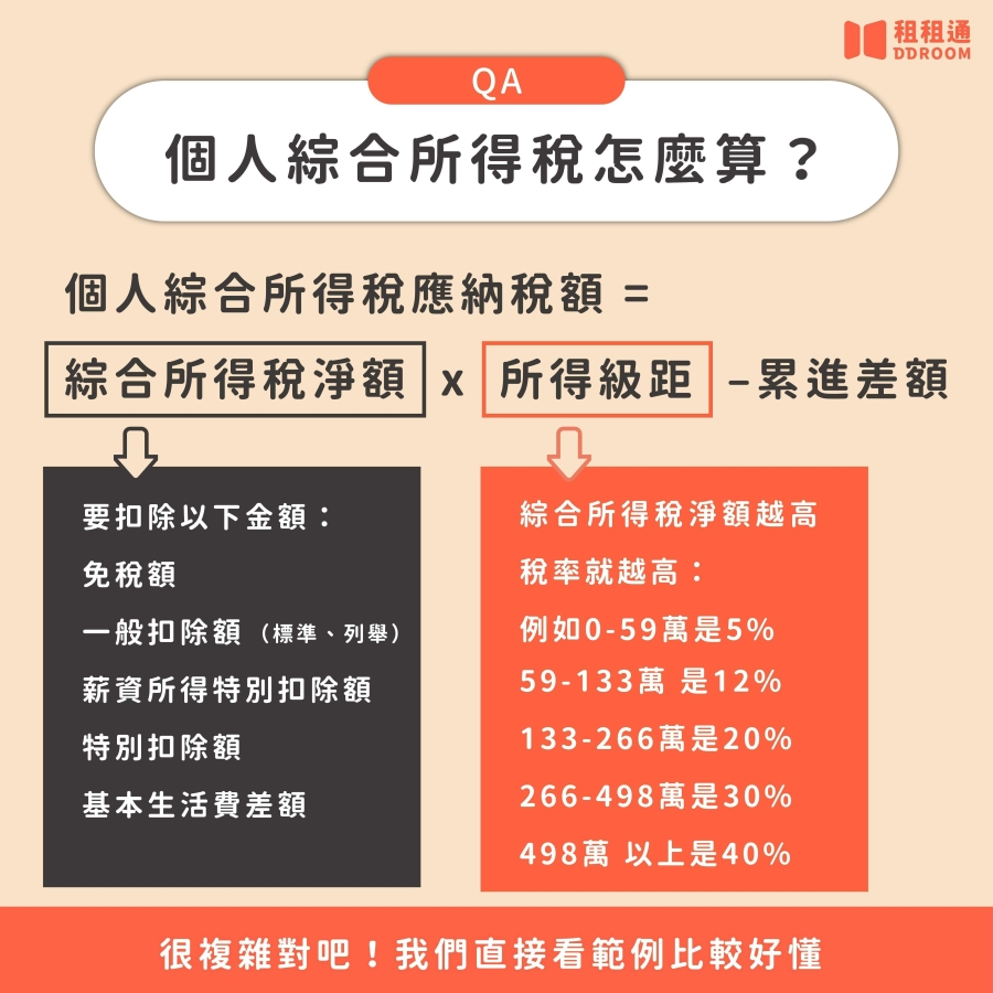 個人綜合所得稅應納稅額= 綜合所得稅淨額(所得總額 - 免稅額 - 標準或列舉扣除額擇一 - 薪資所得特別扣除額- 特別扣除額 - 基本生活費差額)x 所得級距 - 累進差額。