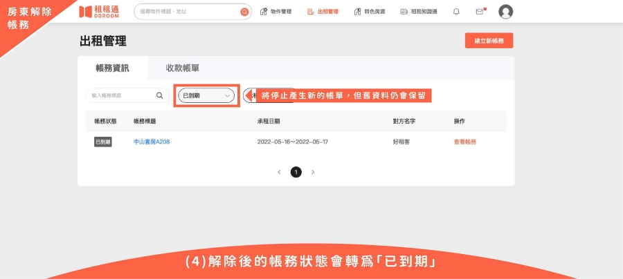 如果因為中途解約而需要停止使用帳務管理功能,請到欲解除管理的帳務資訊點擊「解除帳務」,該筆帳務會移動至「已到期」的狀態,並停止產生新的帳單,舊有的帳單資料仍會保留。如有需要,您可以再點擊「刪除帳務」將該帳務所有資料刪除。