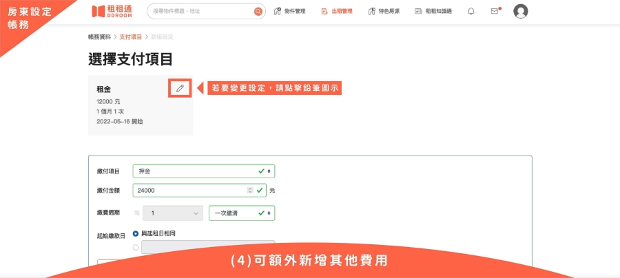 可以點擊「編輯帳務」後在「支付項目」中新增您要增加的費用。請參見上方「二、(出租方)設定帳務資料」中的第5點。