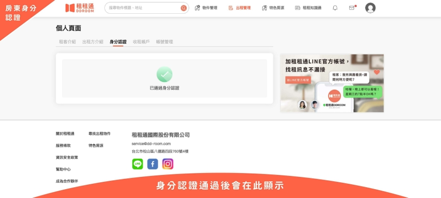 請透過LINE註冊租租通會員,或是登入後點擊右上角大頭貼「個人資料」,再點擊「帳號管理」中綁定LINE登入,就能收到相關通知。