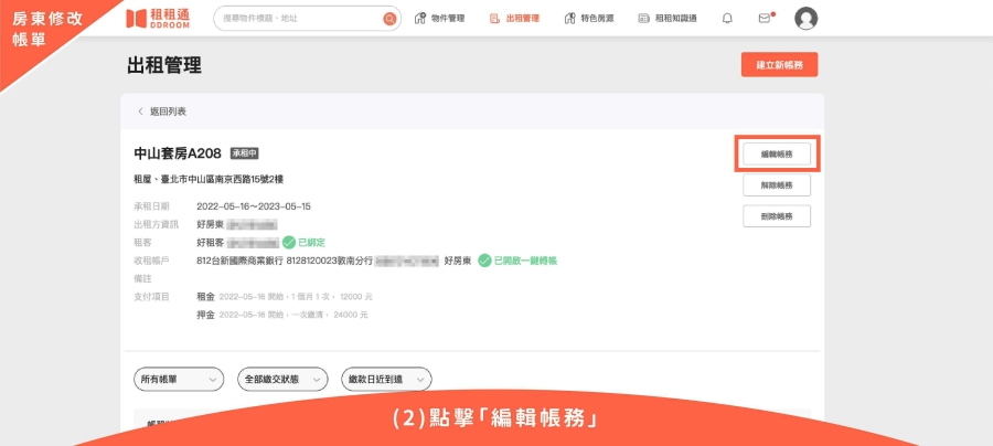 ■ 帳務資訊:代表收款者(出租方)與繳款者(租客)的關係,系統會依照帳務所設定的來產生帳單。